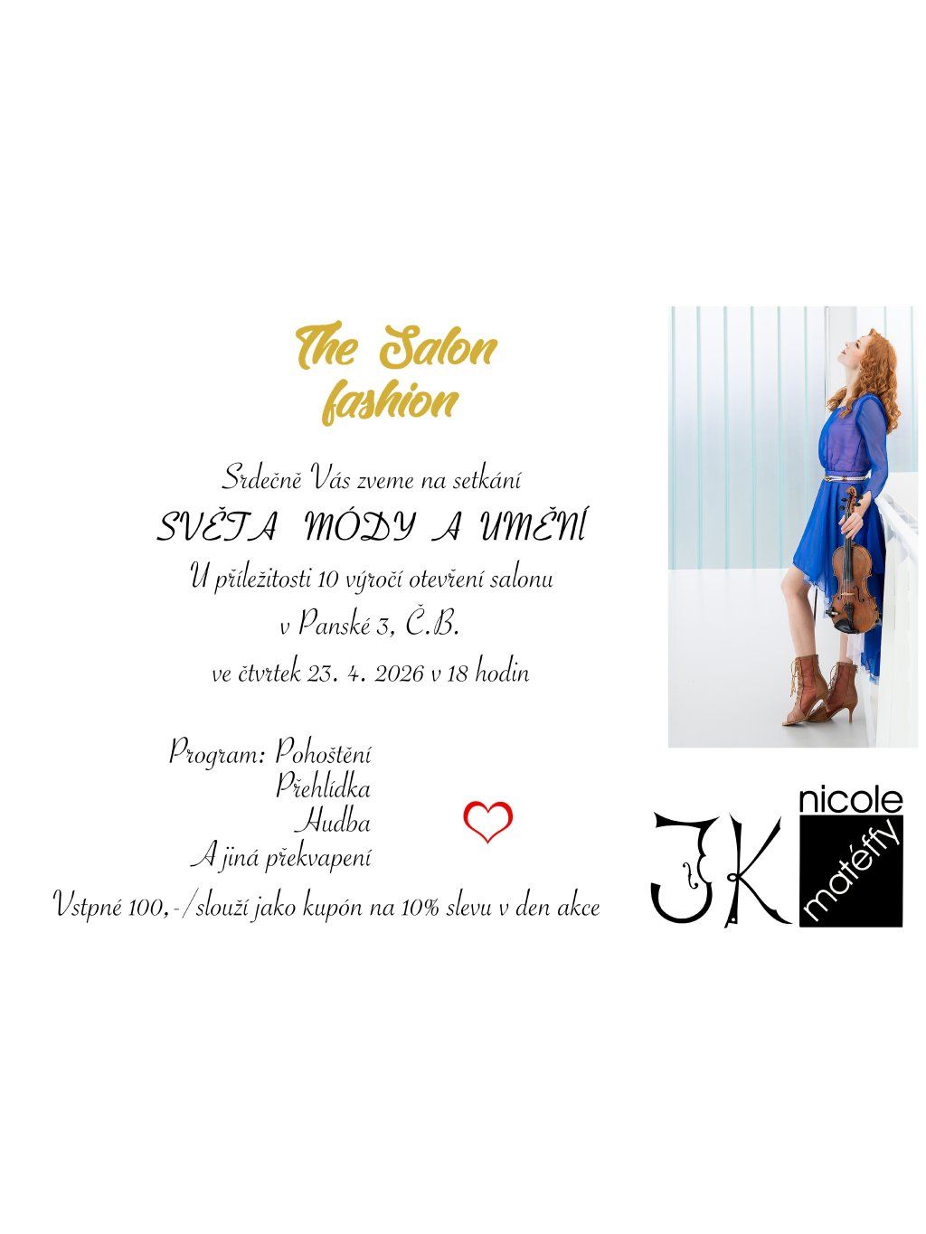 Srdečně vás zveme na setkání světa módy a umění k příležitosti 10. výročí otevření Salonu v Panské 3. Můžete se těšit na módní přehlídku a další překvapení. Setkáme se ve čtvrtek 23.4.2026 v 18:00 v ul. Panská 3 v Českých Budějovicích.